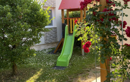 A kertben grillező hely, bogrács, közös kültéri terasz.